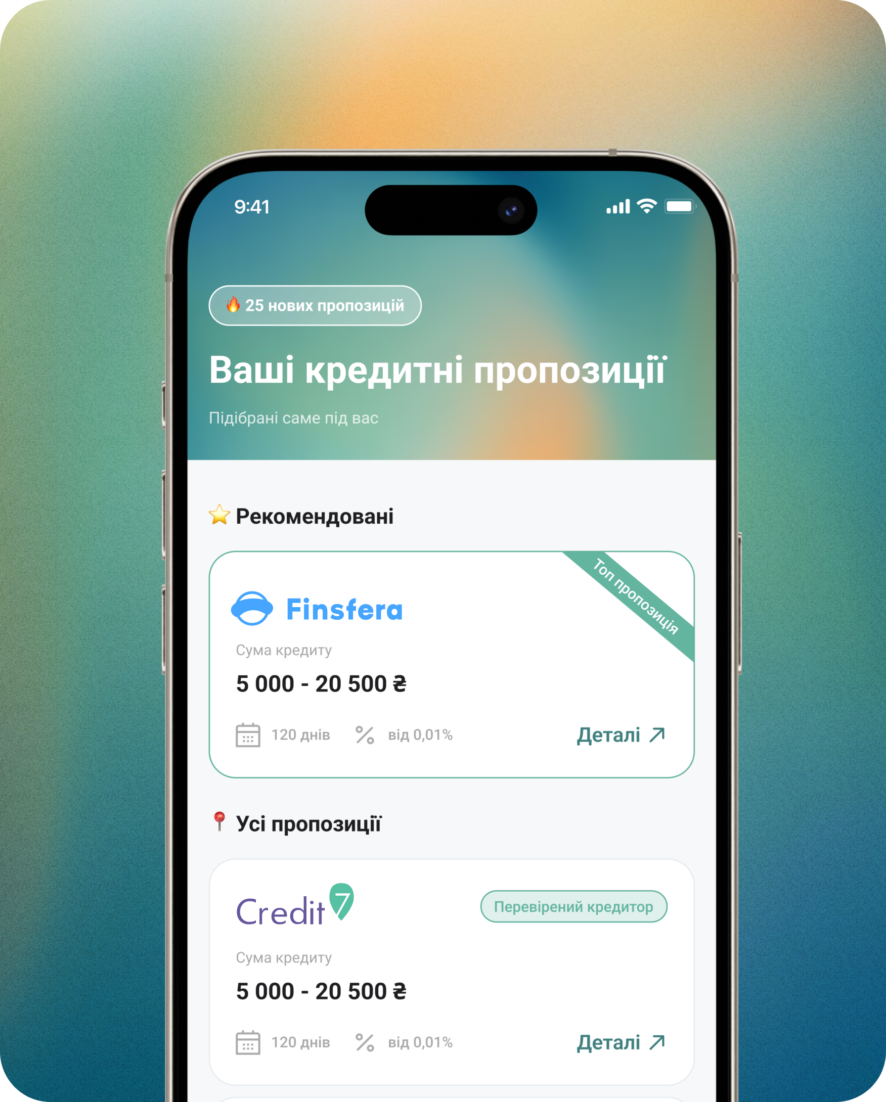 Отримуй найкращі кредитні пропозиції за секунди. Жодних прихованих умов — лише прозорі ставки та висока ймовірність схвалення.